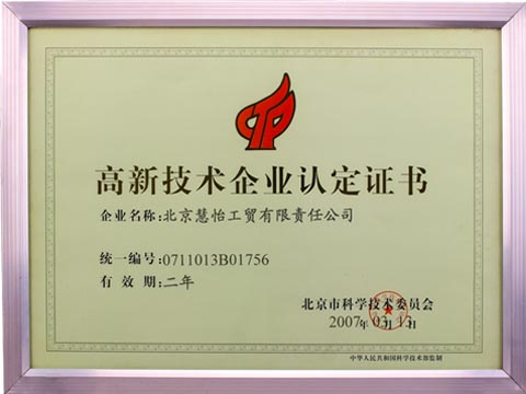 高新技术企业认定证书-企业荣誉-预付费水表,IC卡预付费水表,纯净水水表,北京慧怡阶梯水价水表公司